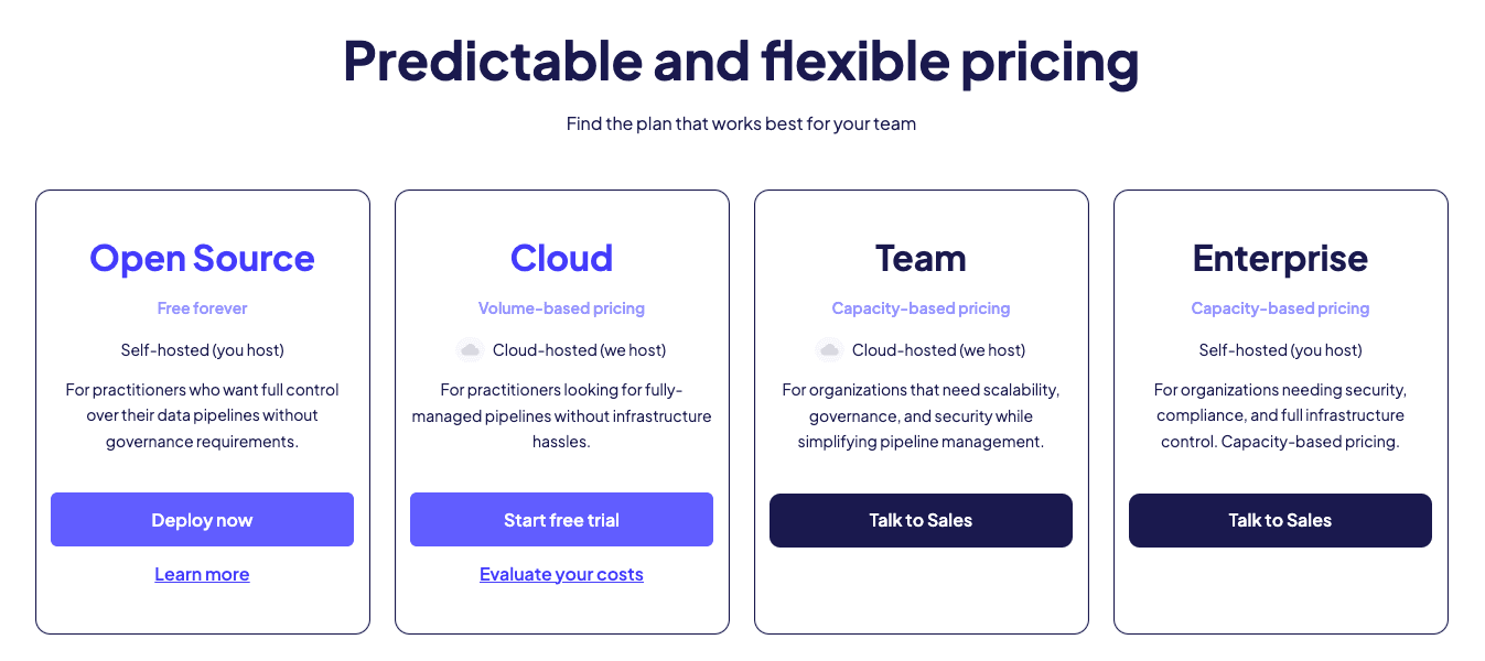 Airbyte has introduced capacity-based pricing for its Teams and Enterprise plans. Instead of charging based on data volume, pricing is now based on Data Workers, which measure the processing power required to run data pipelines efficiently. Customers pay for processing capacity, not fluctuating data usage.
