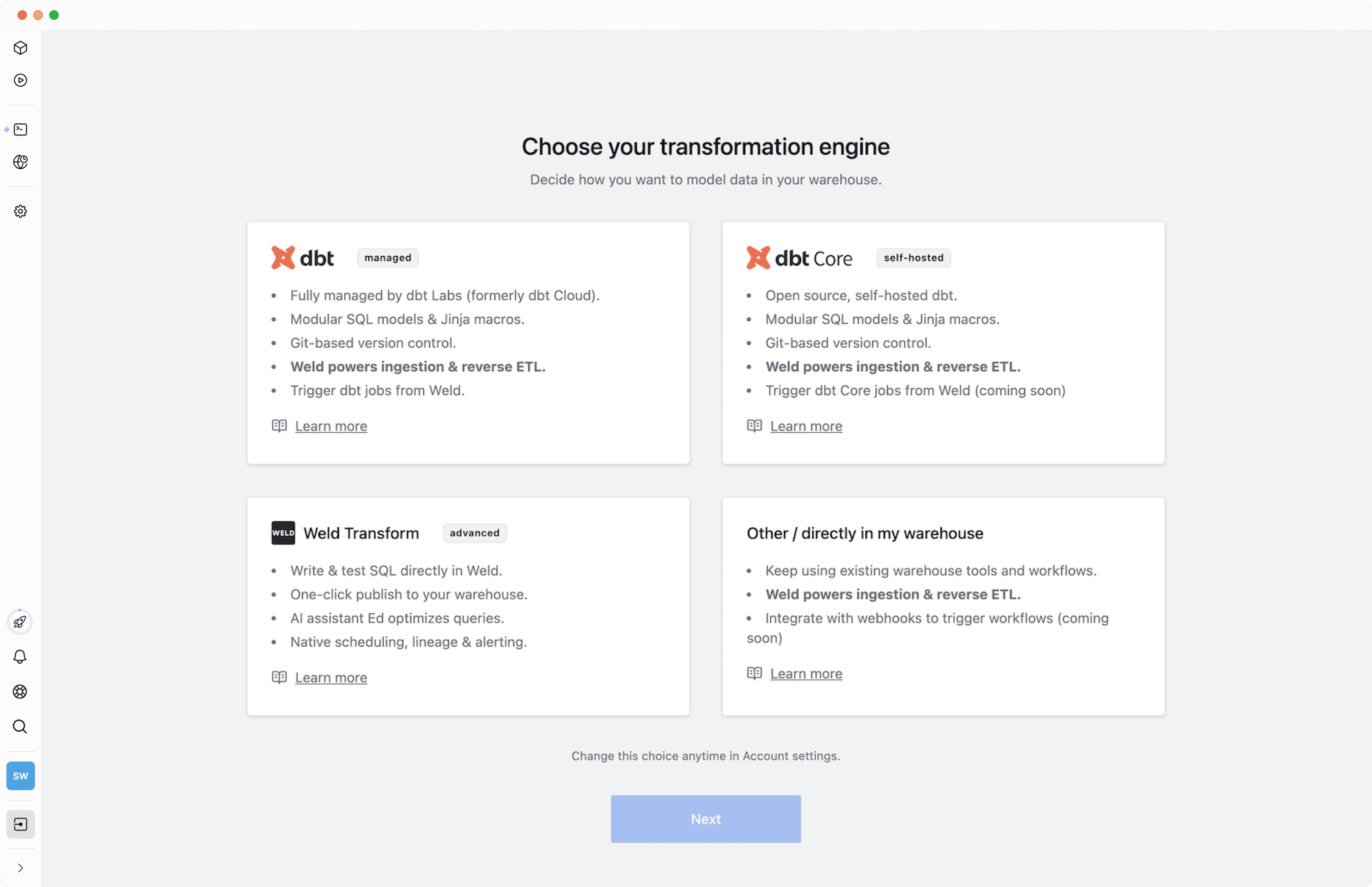- Weld supports dbt Core as a transformation option. You can configure your workspace to reflect that dbt Core is your transformation tool of choice.