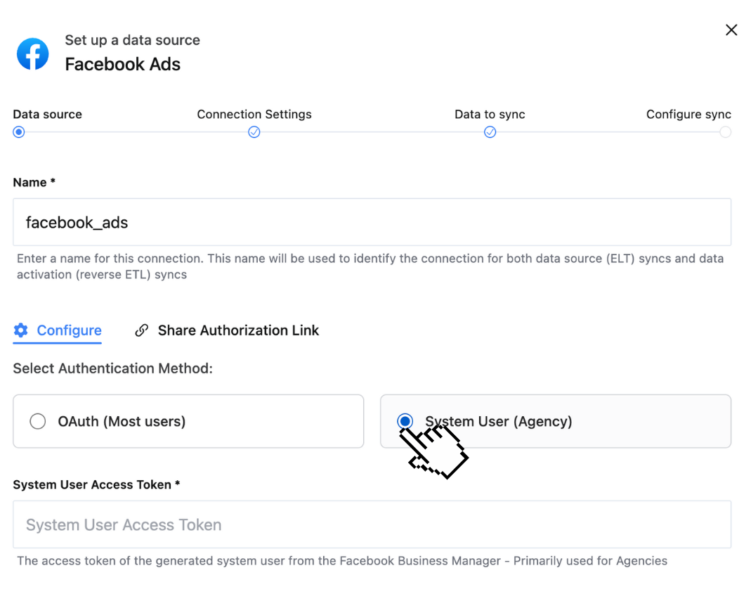 Stable, scalable authentication for agencies via Meta Business Manager. Available under Authentication Method in the connector settings.